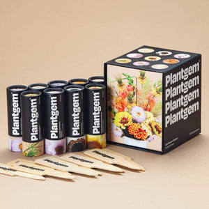 Get ready for an infinite supply of summer bouquets. Reliable, easy growing, totally unique flowers and greenery in one totally nifty-gifty box, ready to go. This mix of seeds will grow you a dreamy garden of cut flowers that will bloom and bloom and bloom all summer long so get your vases and jam jars ready, fam. Includes six types of flower seed tubes that are ideal for cut flowers, individually packed in a reusable box with wooden label stakes for marking all your wee plant babes: Matsumoto White Tipped Blue Aster, Transformer Nigella (Love in a Mist), Feather Top Grass, Fata Morgana Scabiosa, Chantilly Salmon Snapdragon, and Cupcake and Saucers Cosmos.