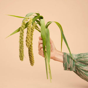 Upright, swaying, lime-green grains on long stems make for a great accompaniment to any bouquet. Millet is the modern version of the cattails of your childhood. Architectural, with deep rich green foliage and stems, these gorgeous grasses will add drama to your garden, arrangements and even dried collection. Includes 100 seeds.