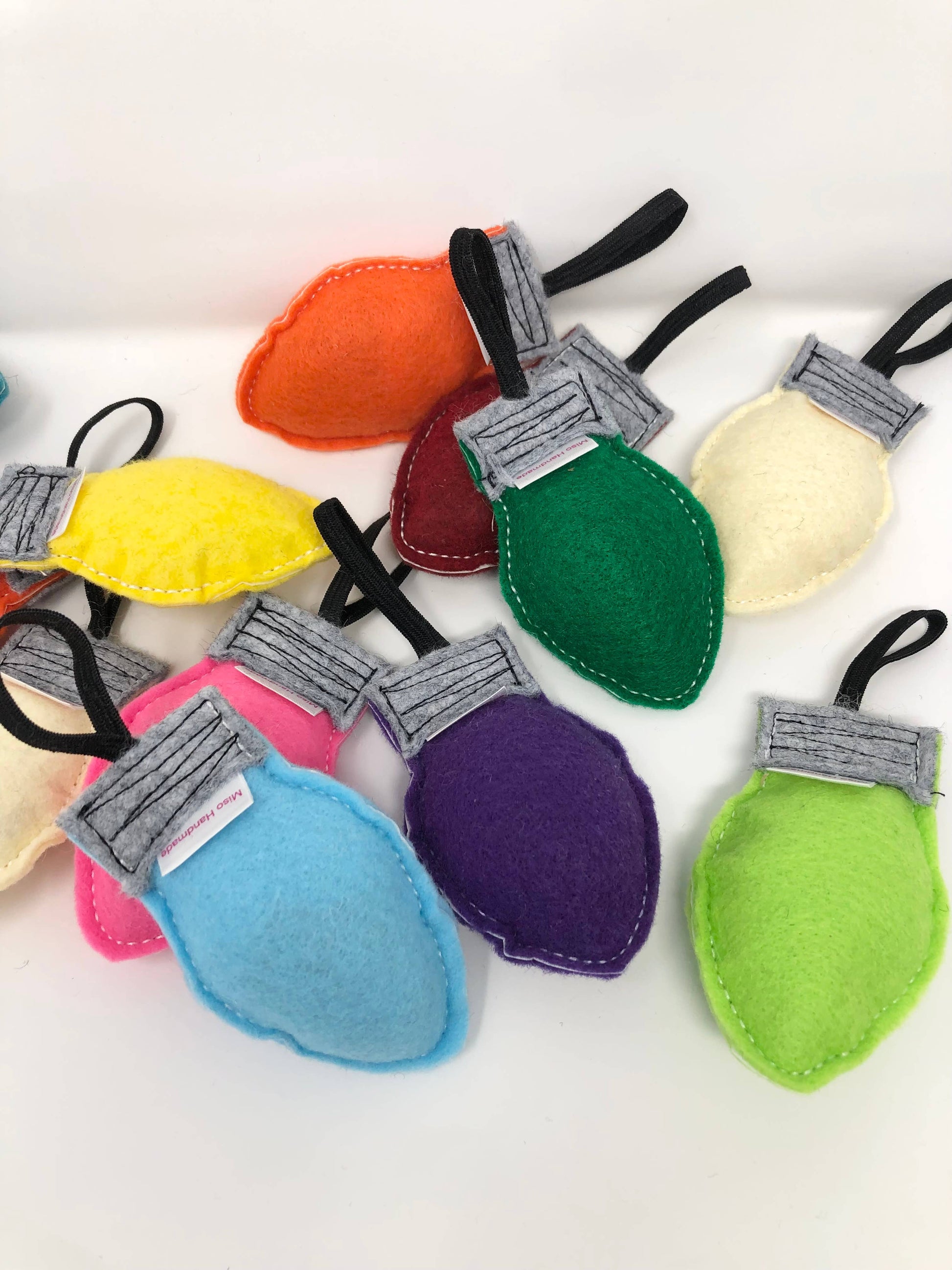 Each string of catnip lights is handmade in the San Francisco Bay Area. We sew them in small batches of super soft wool felt that we sew and fill with catnip before they are sewn onto the elastic band.