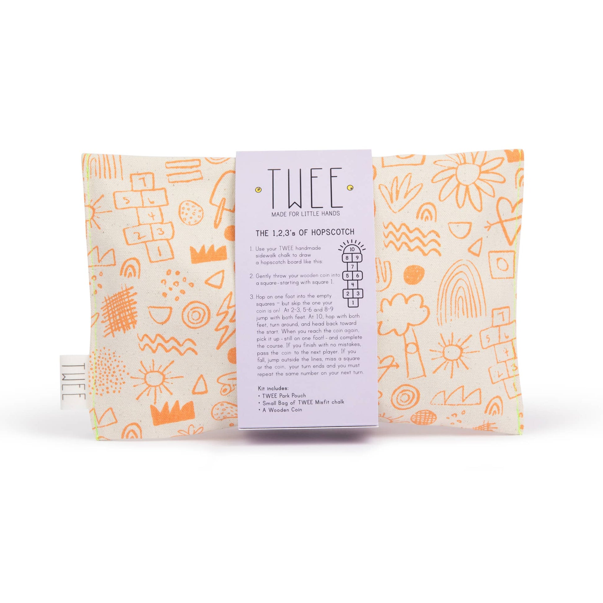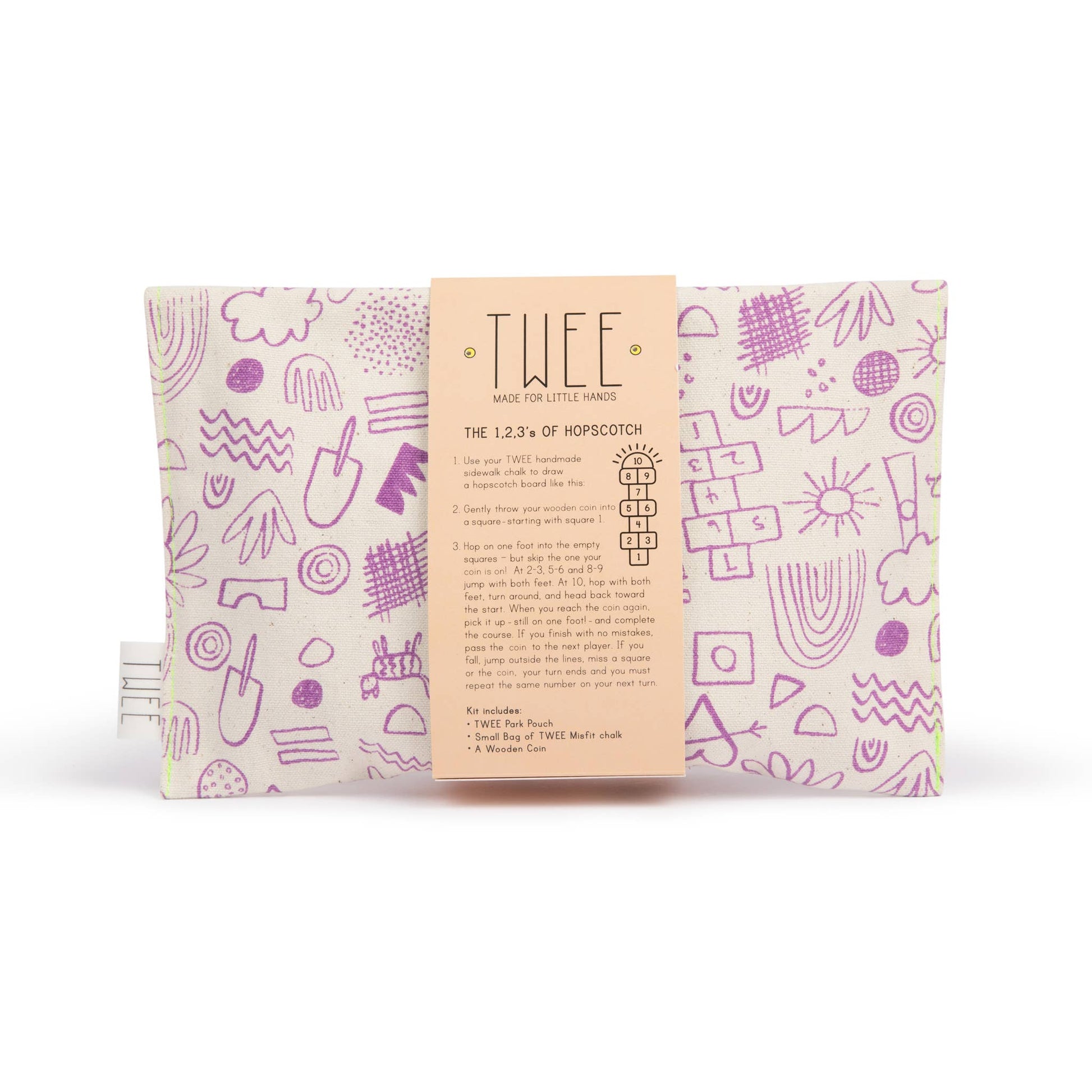 Each kit includes: 1 hand screen-printed cotton canvas pouch, small bag of chalk, 1 wooden coin, directions on how to play. Lined for easy cleanup. Wipe clean with a cold, damp cloth. Eco-friendly, non-toxic.